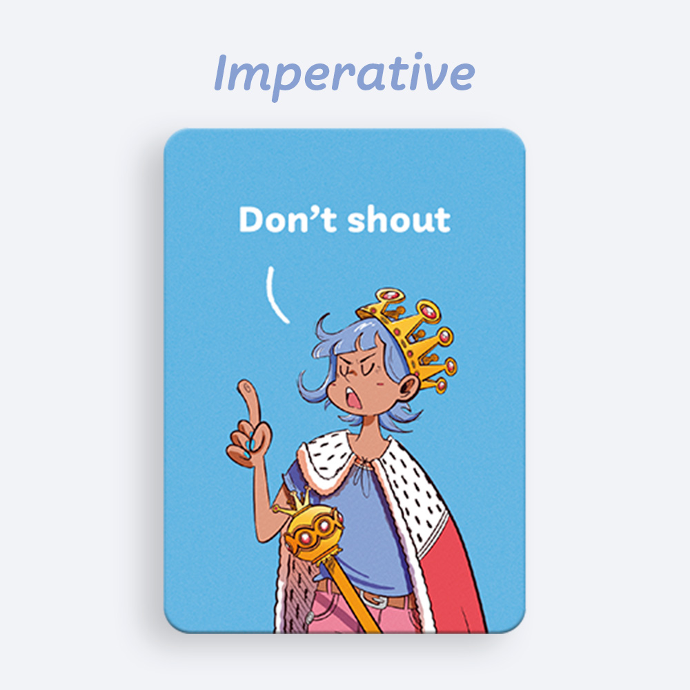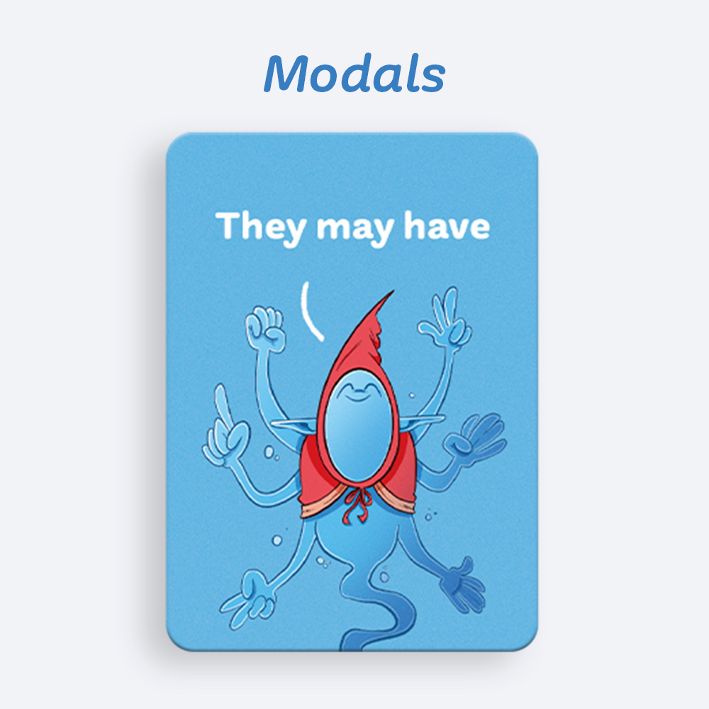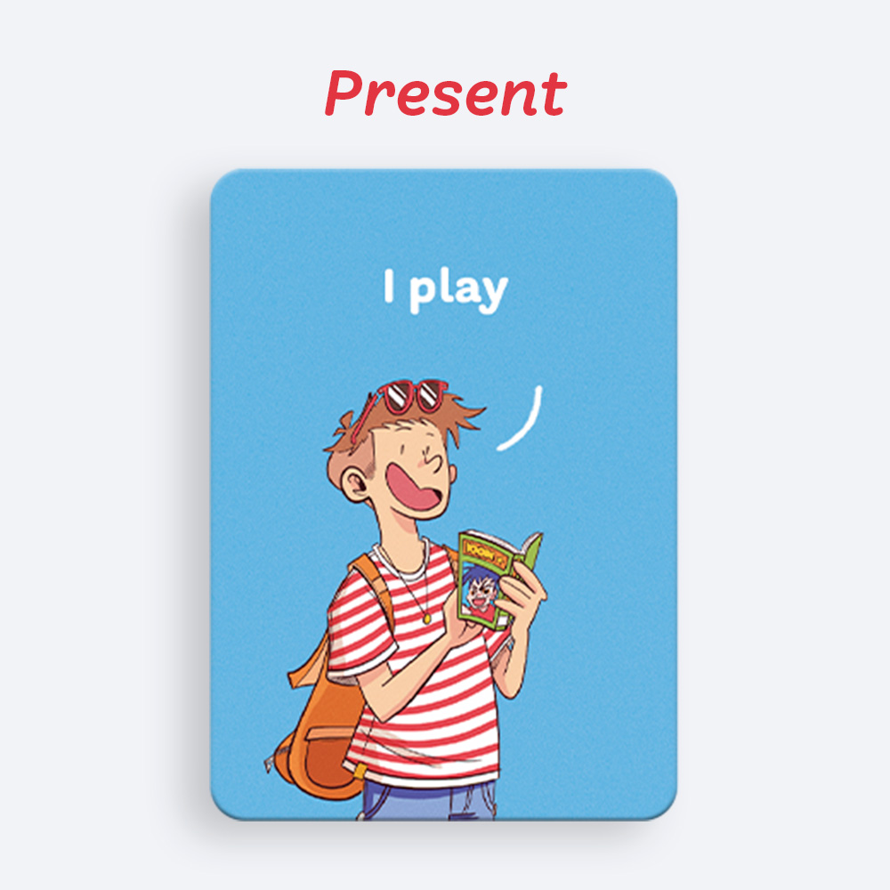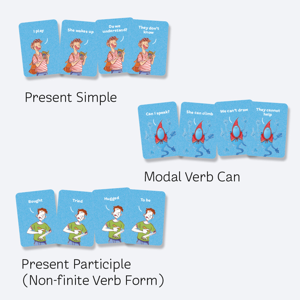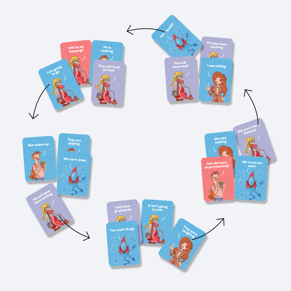 After dealing 4 cards to each player, everyone tries to complete a set by choosing a tense or verb form, a modal verb or the imperative. On each turn, players pass one card to the right and receive one from the left. The game continues until a player completes a valid set, declares it aloud and slaps their hand on the table. All players must do the same: the last one loses a point.