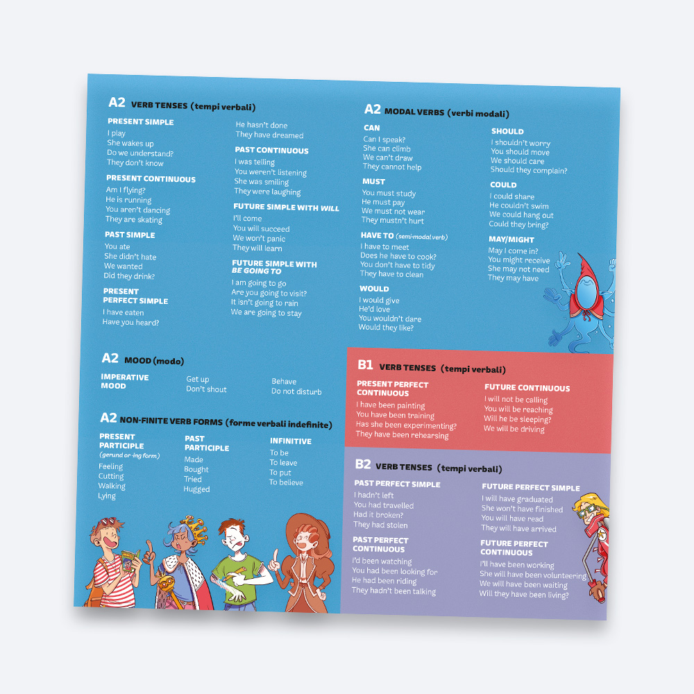 VerbING is an educational game for children aged 11 and up, designed to help them recognise and classify English verb tenses in a simple and enjoyable way. The aim of the game is to be the first to complete a set of four cards sharing the same tense, mood, form or modal verb.