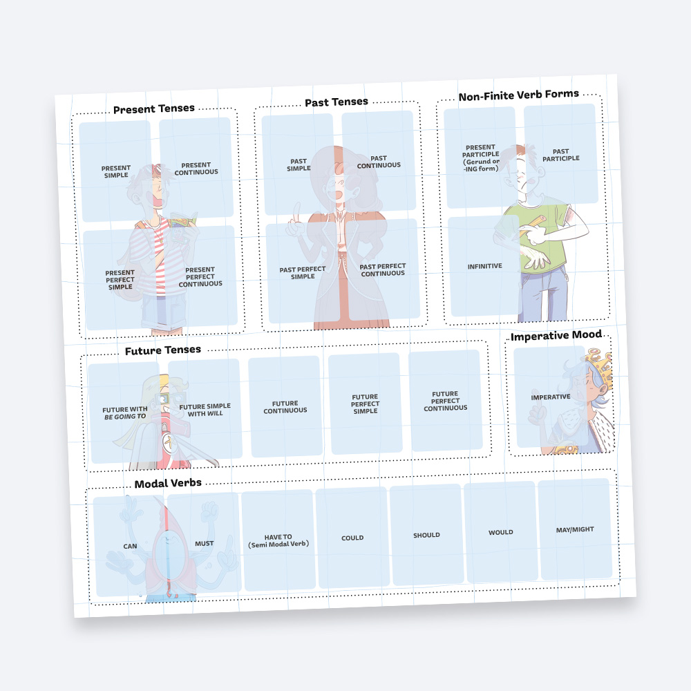 Before starting the game, the cards must be divided into sets according to tense, mood, form or modal verb, creating 24 sets of 4 cards. Select as many sets as there are players.