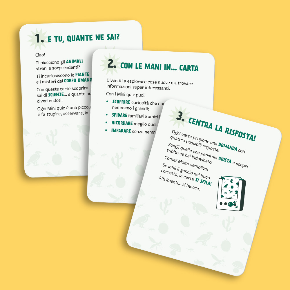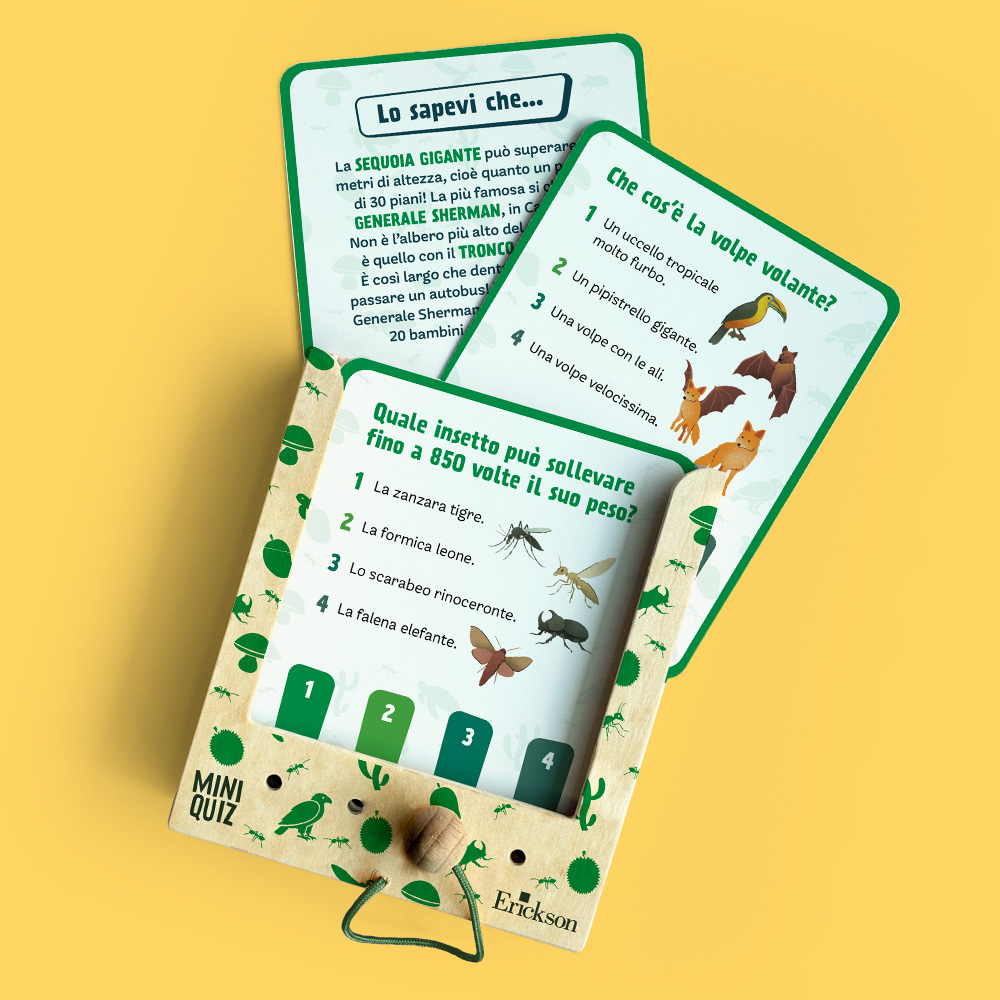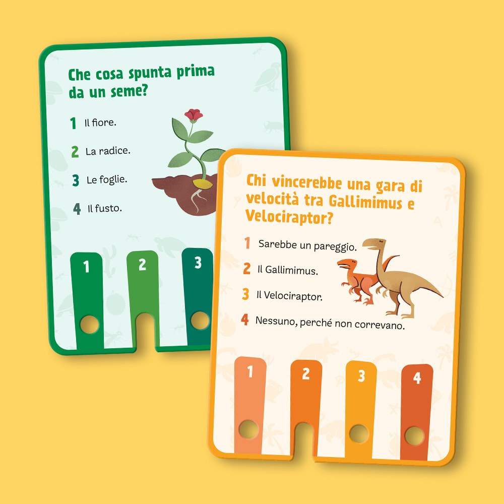 Players read the question, choose the answer and find out whether it is correct thanks to a hook-based self-correcting mechanism: if the card slides out, the answer is correct.THE BOX CONTENTS