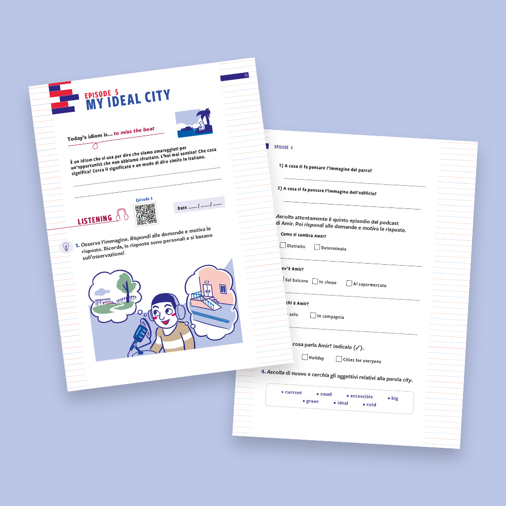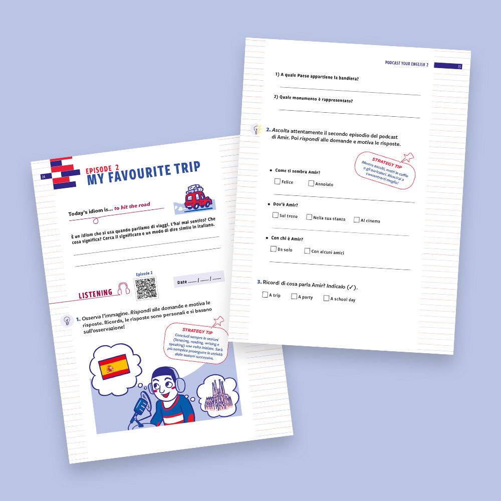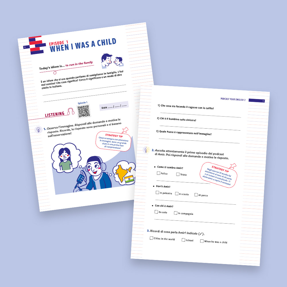 Podcast your English 2 is designed as a holiday workbook for Year 7 students. The protagonist, Amir, a boy of Indian origin, accompanies readers through six episodes: by listening to his podcast, you learn to work on listening, reading, writing and speaking in an integrated and progressive way. The goal broadens from traveling to the ideal city to the topic of online responsibility, reflecting the growth of young people and the challenges of their age. Each episode starts with an idiomatic sentence from the spoken language and ends with a self-evaluation section, leading up to the final goal: recording your own podcast in English. Find out more!