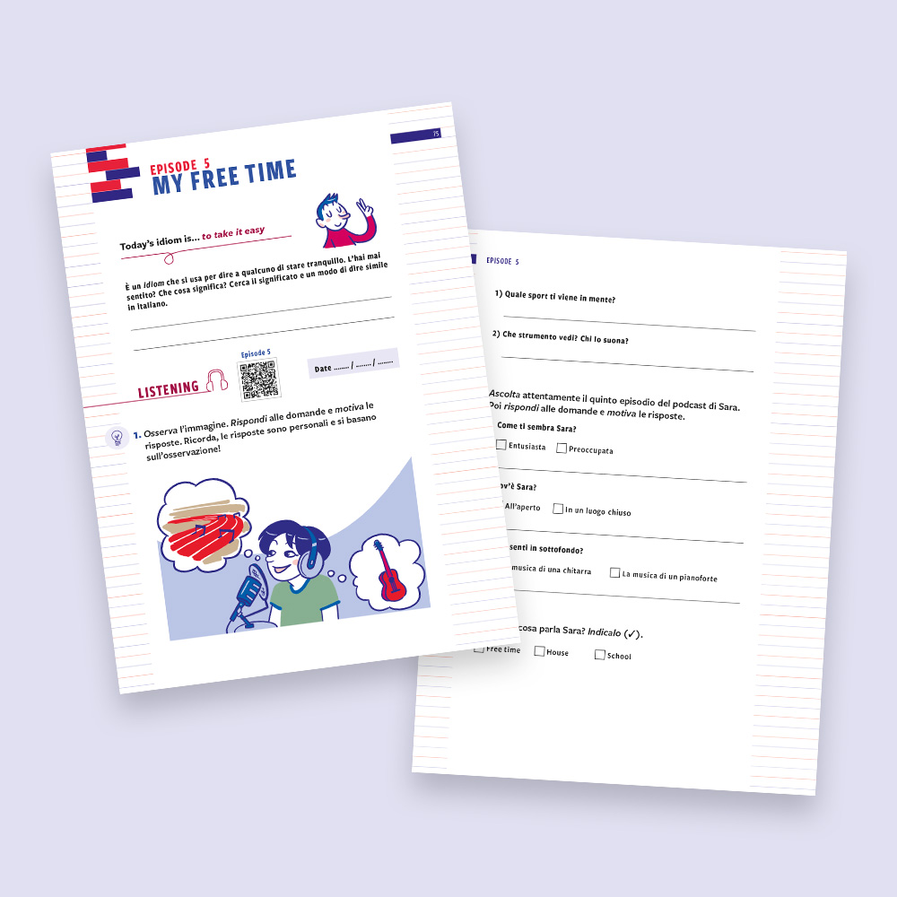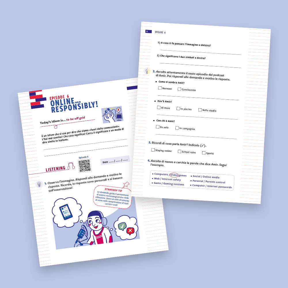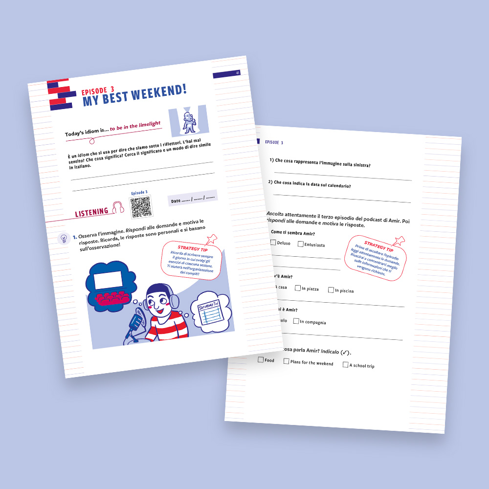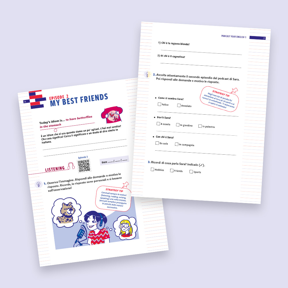 Podcast your English 2 is designed as a holiday workbook for Year 7 students. The protagonist, Amir, a boy of Indian origin, accompanies readers through six episodes: by listening to his podcast, you learn to work on listening, reading, writing and speaking in an integrated and progressive way. The goal broadens from traveling to the ideal city to the topic of online responsibility, reflecting the growth of young people and the challenges of their age. Each episode starts with an idiomatic sentence from the spoken language and ends with a self-evaluation section, leading up to the final goal: recording your own podcast in English. Find out more!