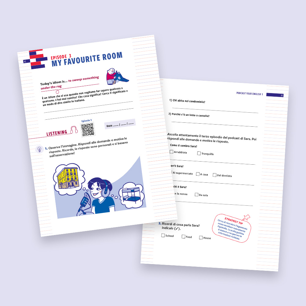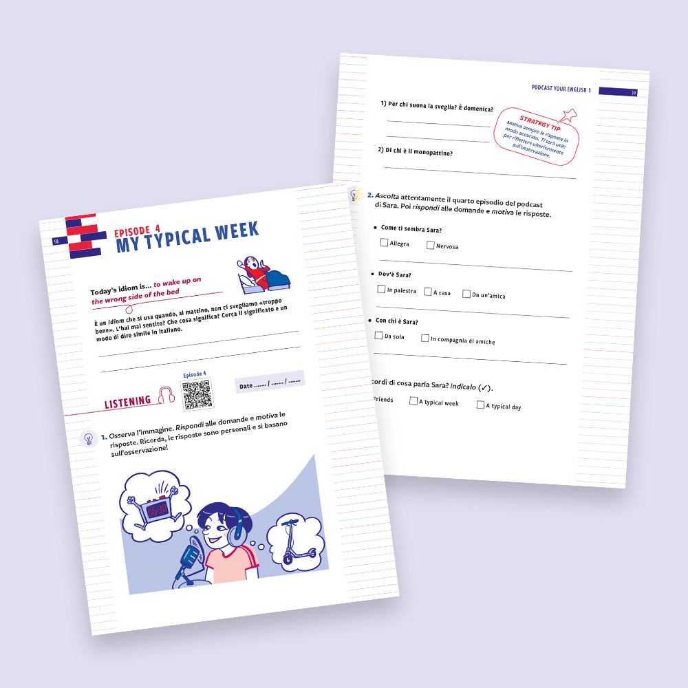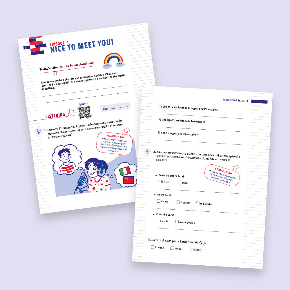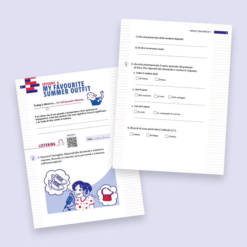 Podcast your English 1 is designed as a holiday workbook for Year 7 students. The protagonist, Sara, an Italian Chinese girl, accompanies readers through six episodes: by listening to her podcast, you learn to work on listening, reading, writing and speaking in an integrated and progressive way. Each episode starts with an idiomatic sentence from the spoken language, addresses a topic related to everyday life and ends with a self-assessment section. The final goal is to record your own podcast — with your smartphone, in English, talking about yourself. Find out more!