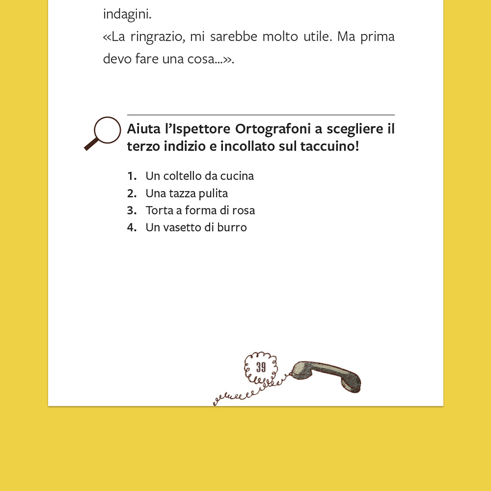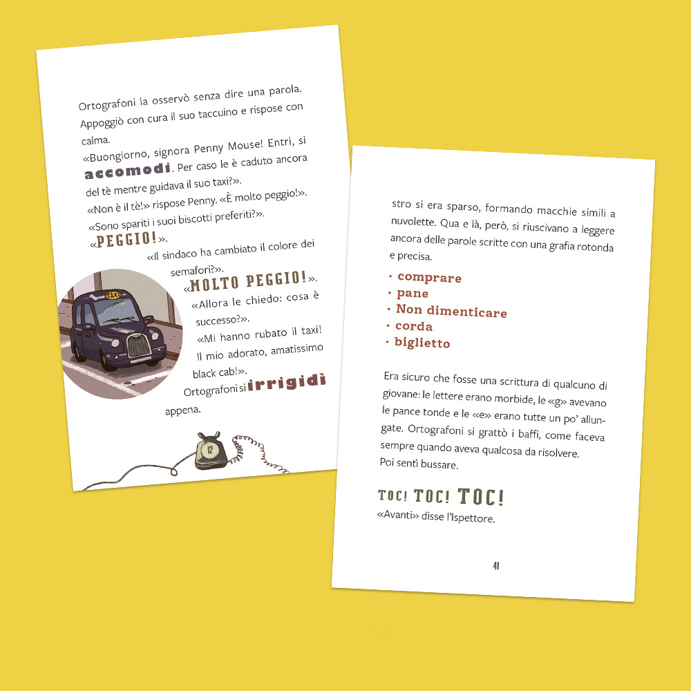 The (mis)adventures of Inspector Ortografoni Silvia Baldi, Susi Cazzaniga When a small, elegant mouse wearing a delightful little hat and large glasses bursts into his office to report the disappearance of his beloved black cab, Inspector Ortografoni already knows it will be a textbook case. Or rather: a notebook case! And so begins an investigation through fog, suspicion and details to be observed carefully — even in the text itself. Find out more!
