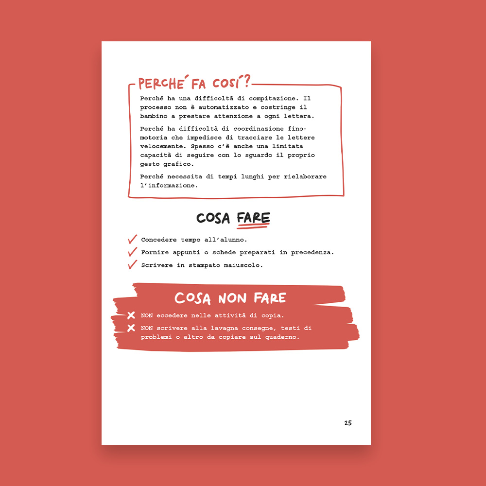 This is a quick guide for teachers of primary school presenting 15 common problem situations and difficulties associated with dysgraphia and dysorthography. The guide offers suggestions on which approach teachers should adopt — and which must avoid — when facing with these problematic situations.