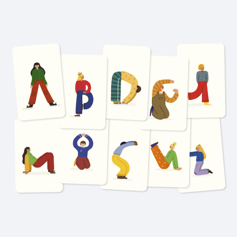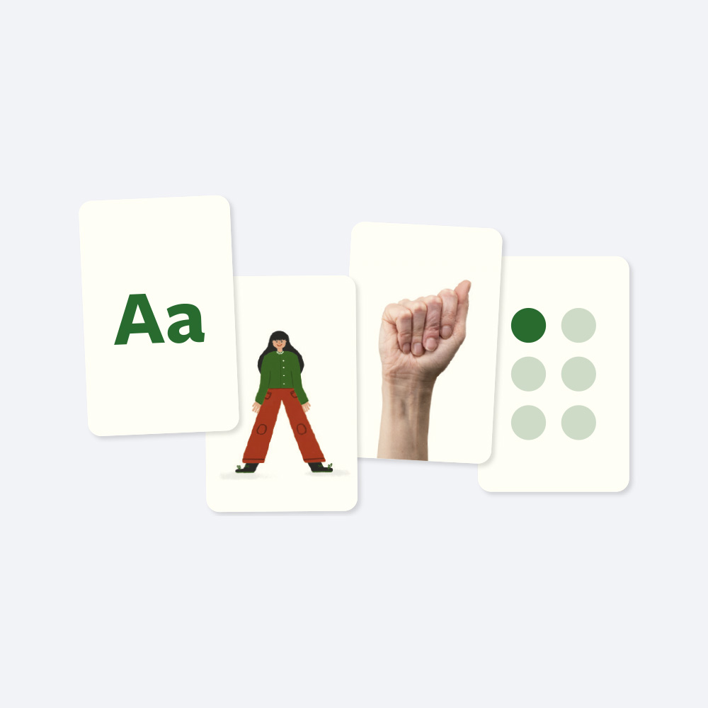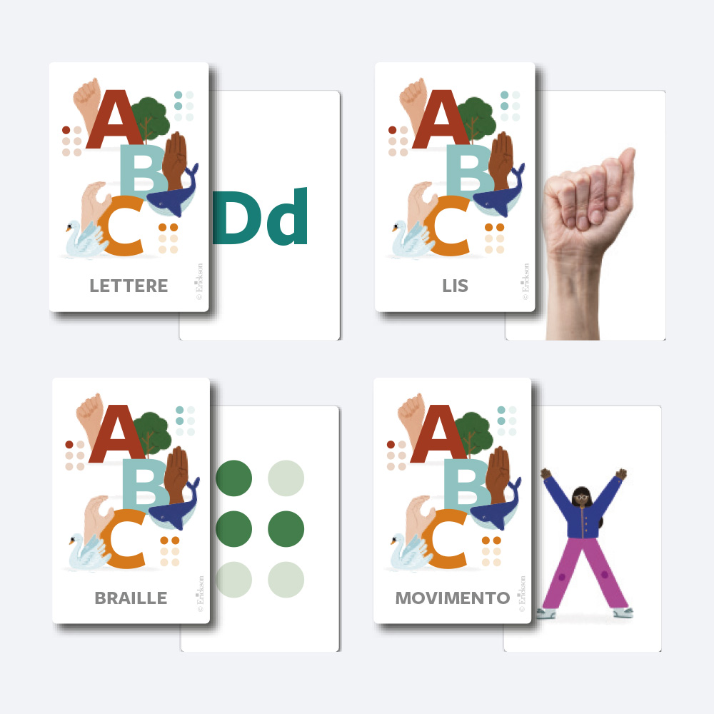 4 decks of 26 cards (letters, LIS signs, Braille letters, and letters in movement)
