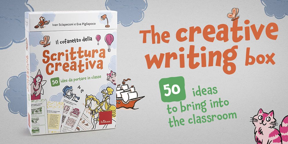 Inside the box are 50 activity cards divided into three levels of difficulty: from the simplest tasks that unlock imagination to more complex challenges for creating original narrative texts.