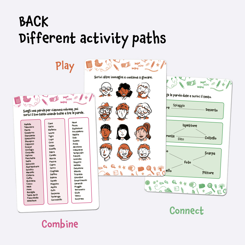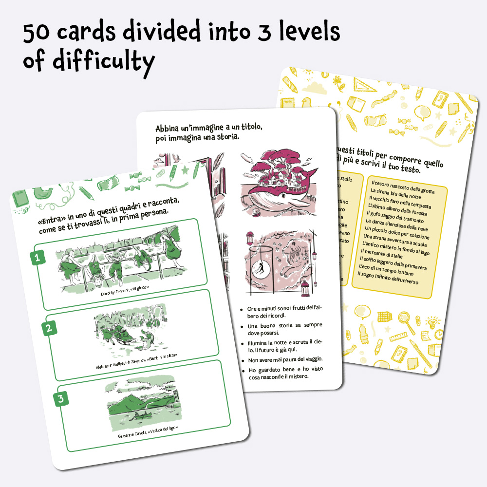 Inside the box are 50 activity cards divided into three levels of difficulty: from the simplest tasks that unlock imagination to more complex challenges for creating original narrative texts.