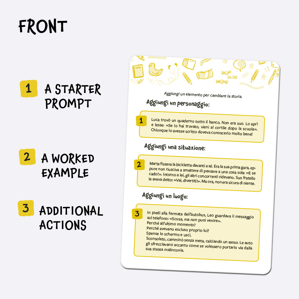 Each activity can be carried out individually, in small groups or with the whole class, and can be easily adapted to the students’ starting level and specific needs. The accompanying guide offers practical suggestions for integrating the cards into flexible, personalised teaching paths, suitable even for informal or home learning contexts.